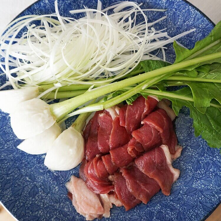 噛みしめると 赤身肉の旨み がじゅわっと広がる。 風味豊かな肉の味 をダイレクトに感じられる鴨鍋。 用意するのはスライスした鴨肉(8mm前後)と、ネギ、セリ、水菜、クレソンなどお好きな葉野菜だけ。