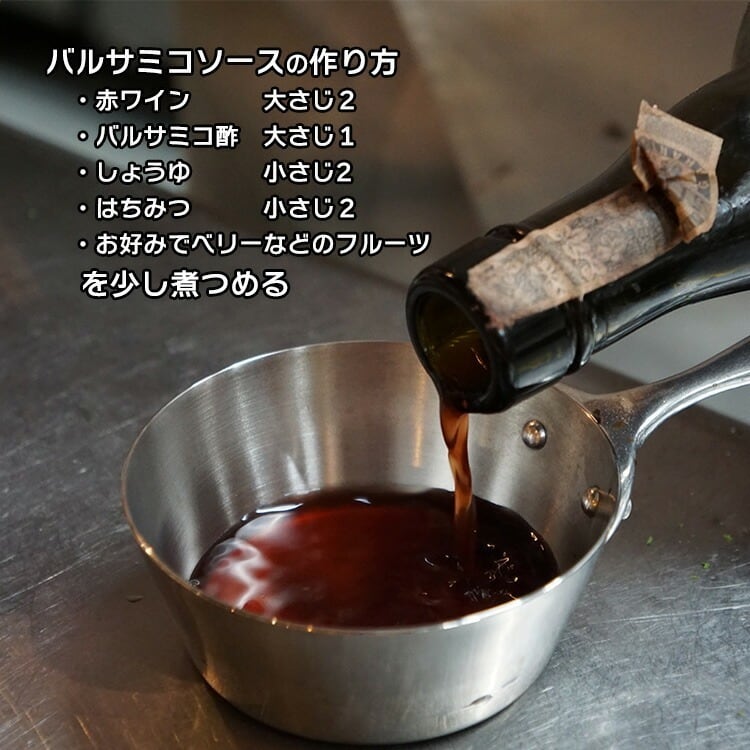 ワイン、バルサミコ酢、はちみつ(又はジャム)、お醤油だけで簡単にバルサミコソースが出来上がります。 今宵、ワインと一緒におしゃれなディナーはいかがでしょうか?