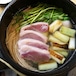 噛みしめると 赤身肉の旨み がじゅわっと広がる。 風味豊かな肉の味 をダイレクトに感じられる鴨鍋。 用意するのはスライスした鴨肉(8mm前後)と、ネギ、セリ、水菜、クレソンなどお好きな葉野菜だけ。